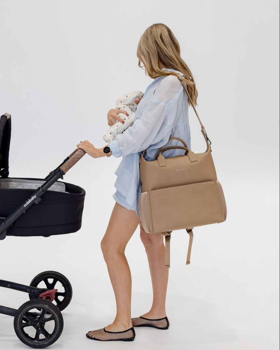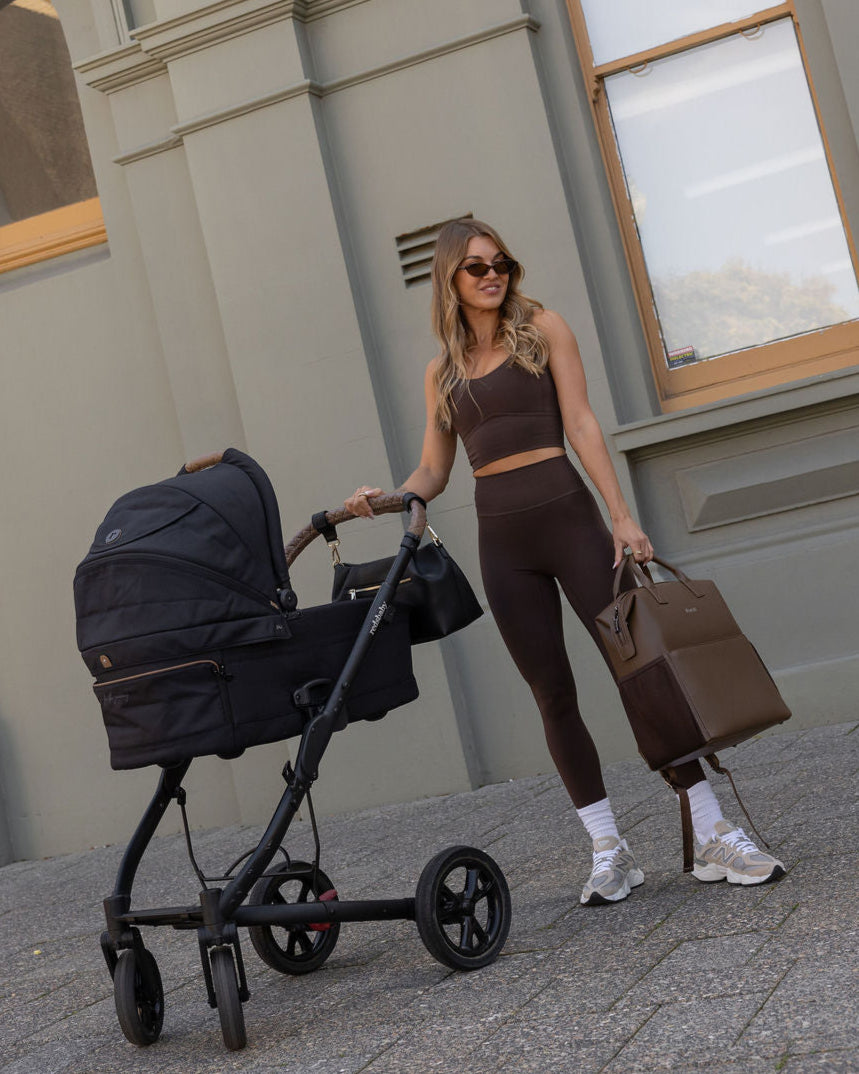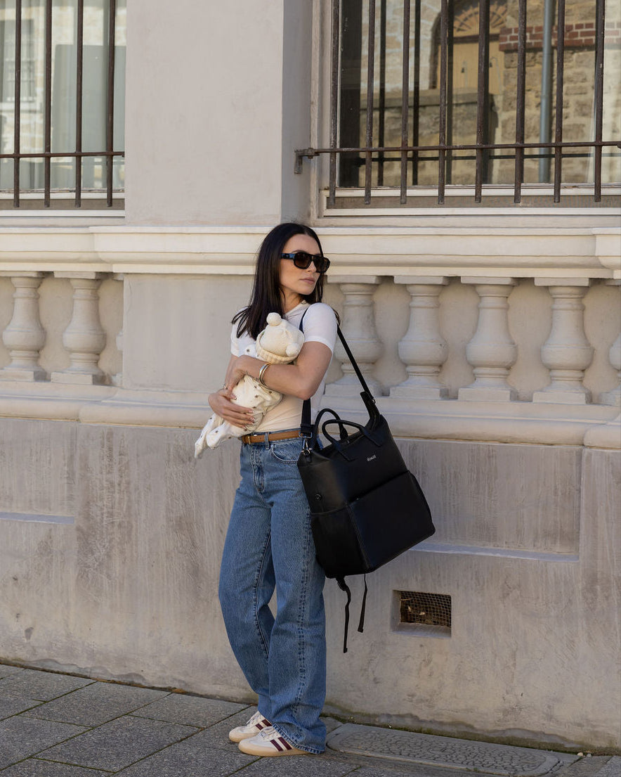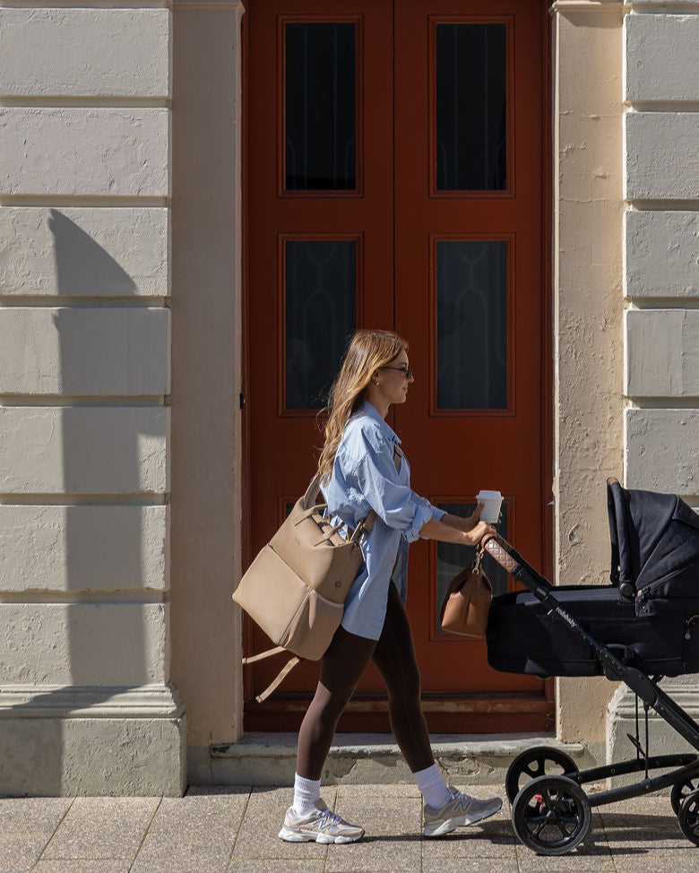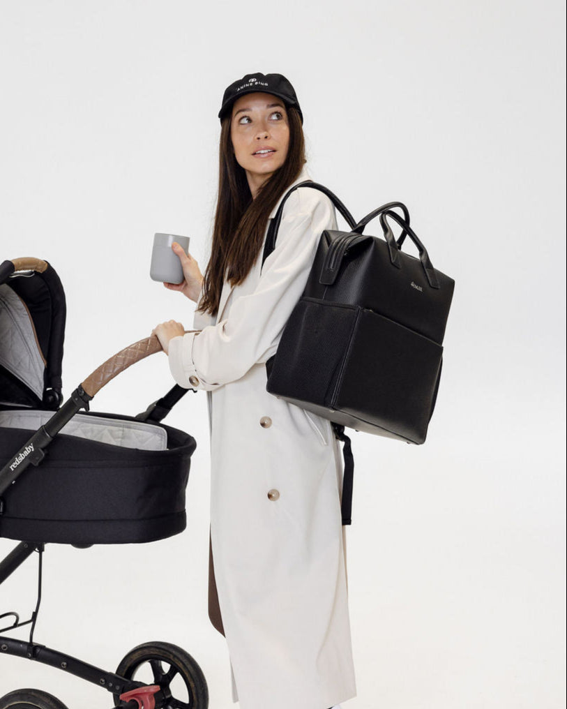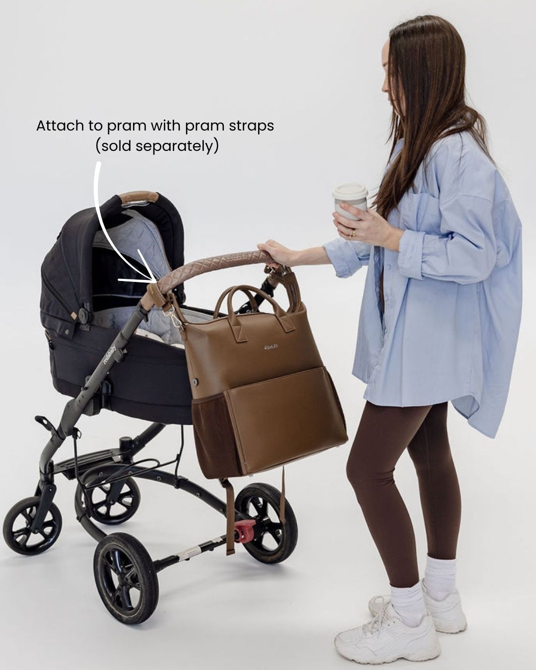 D-rings on both sides so the bag can be worn as a shoulder bag with the shoulder strap attachment (included) or attached to your pram via pram straps (sold separately).