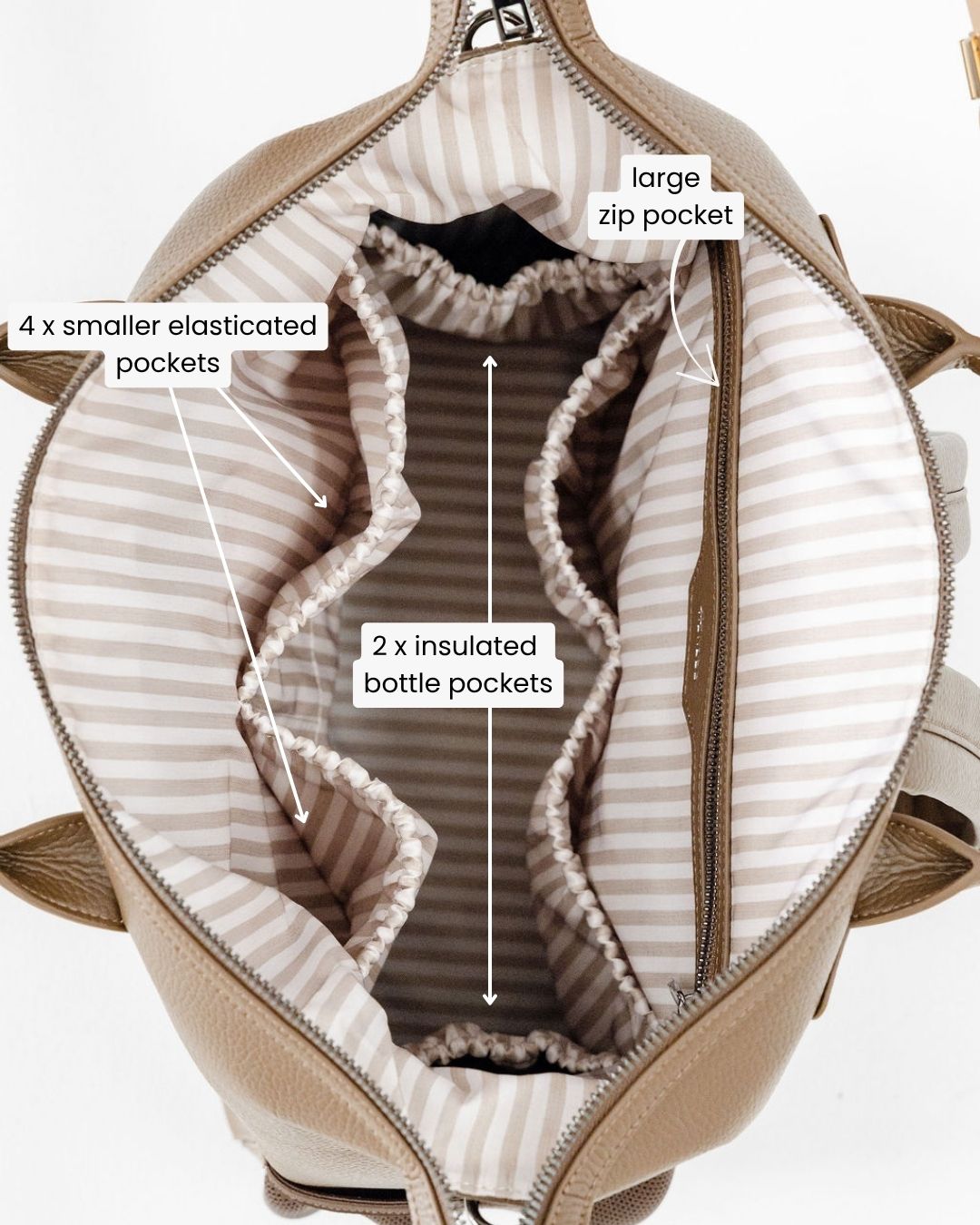 4 elasticised pockets positioned at various heights for convenient access - fill the higher pockets with your go-to items for easy reach even when the bag is packed to the brim.