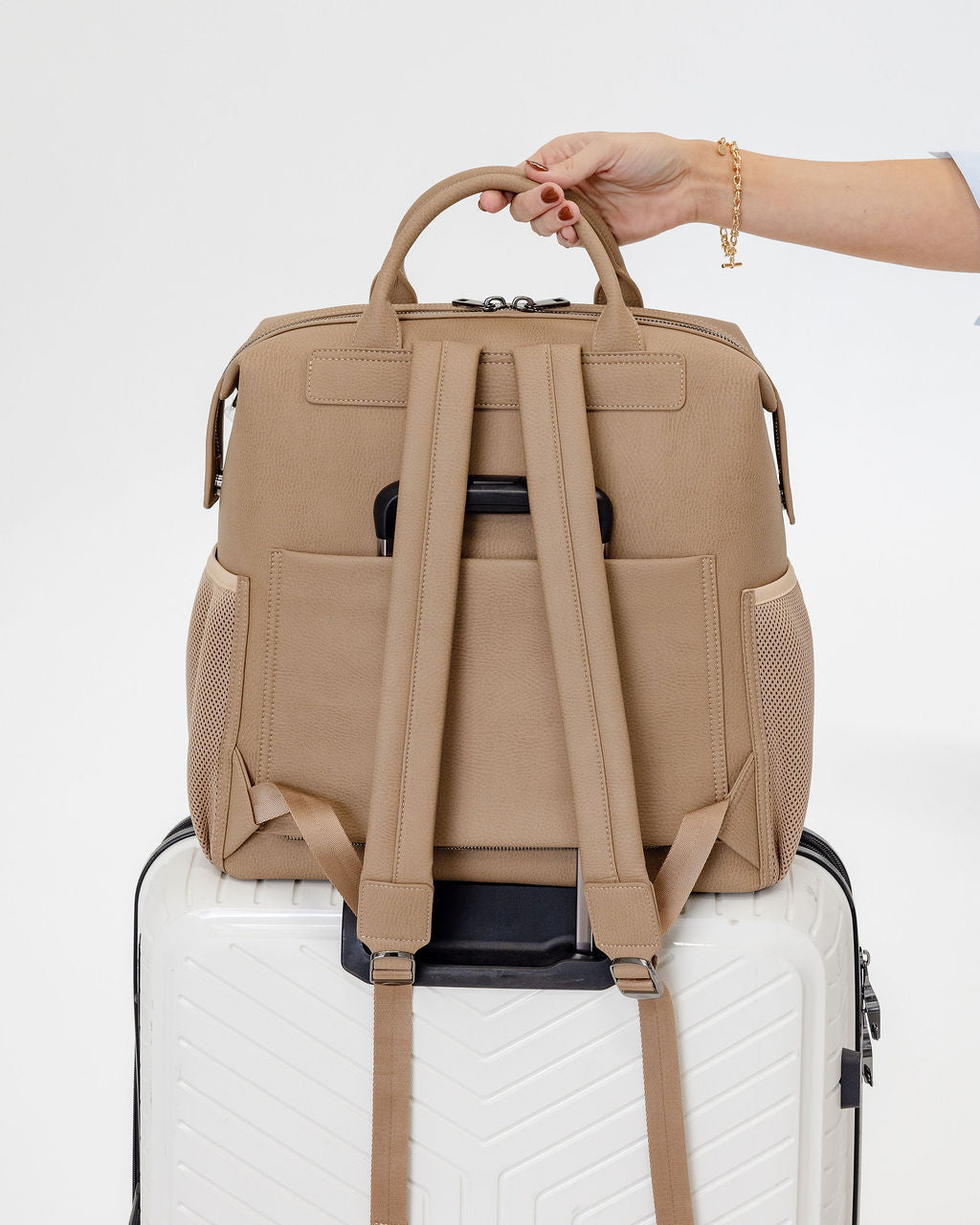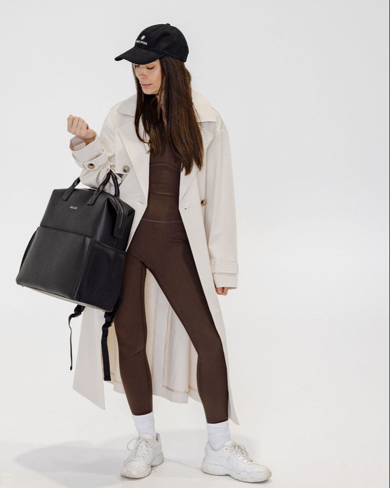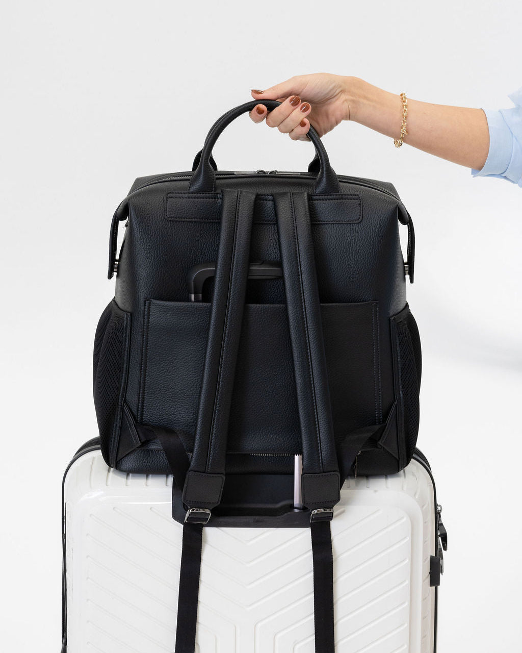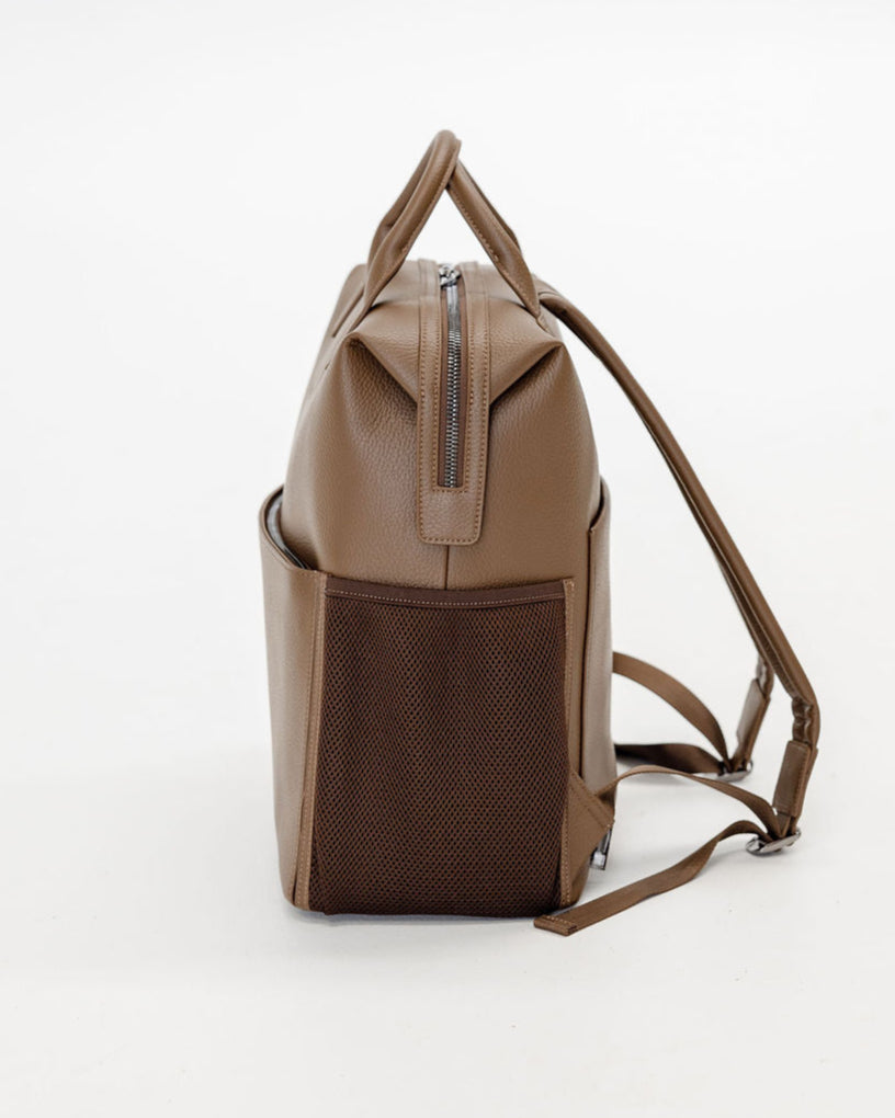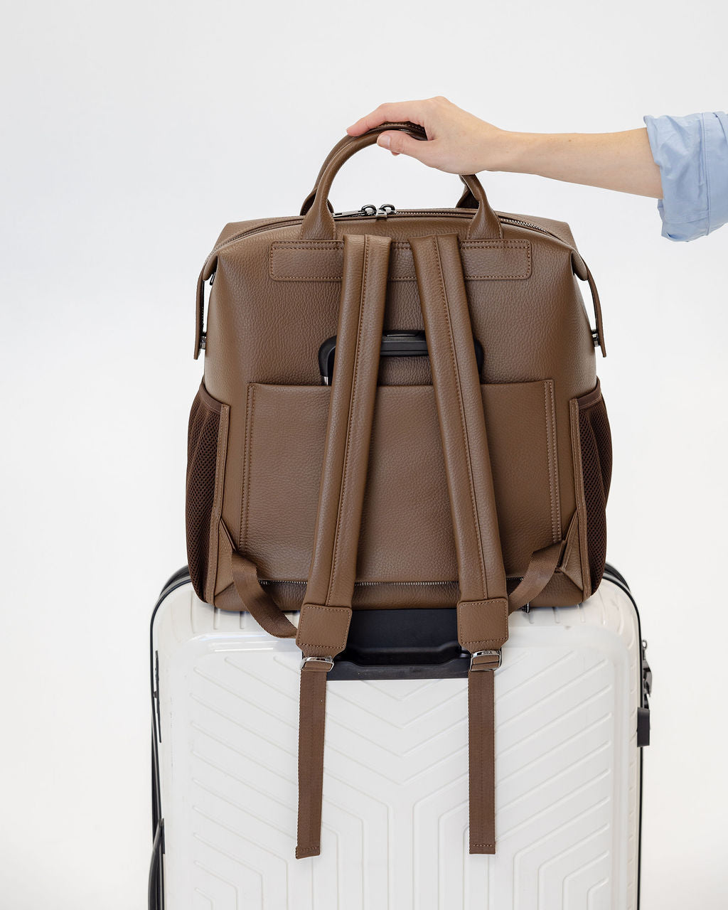 Large slip pocket on back side which converts into a luggage sleeve for travel.