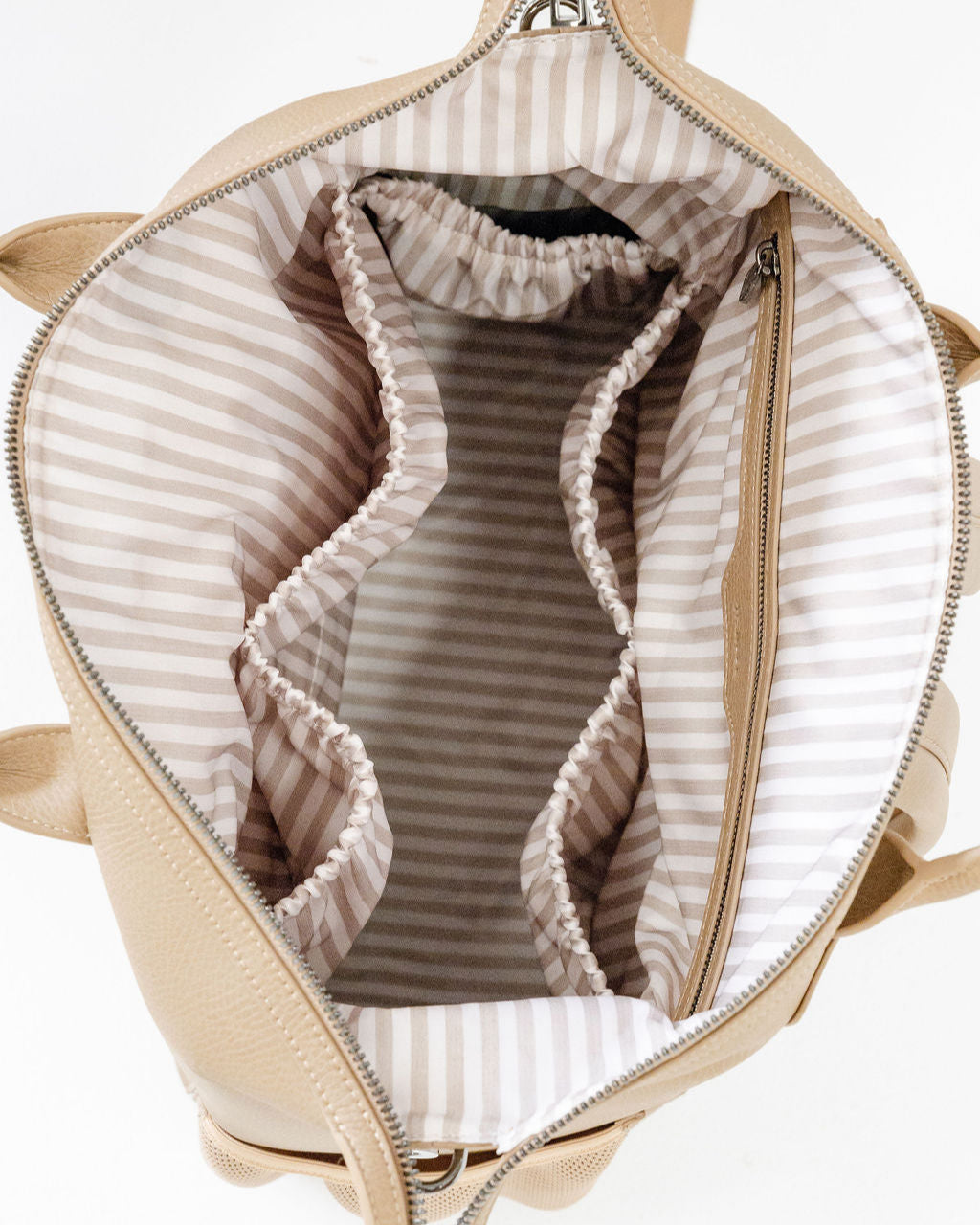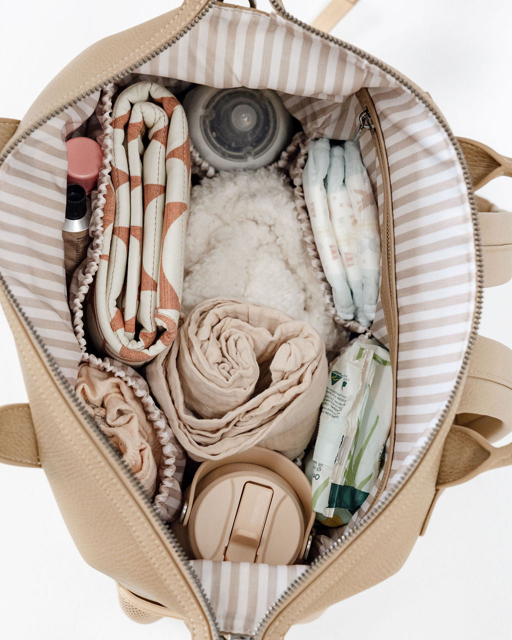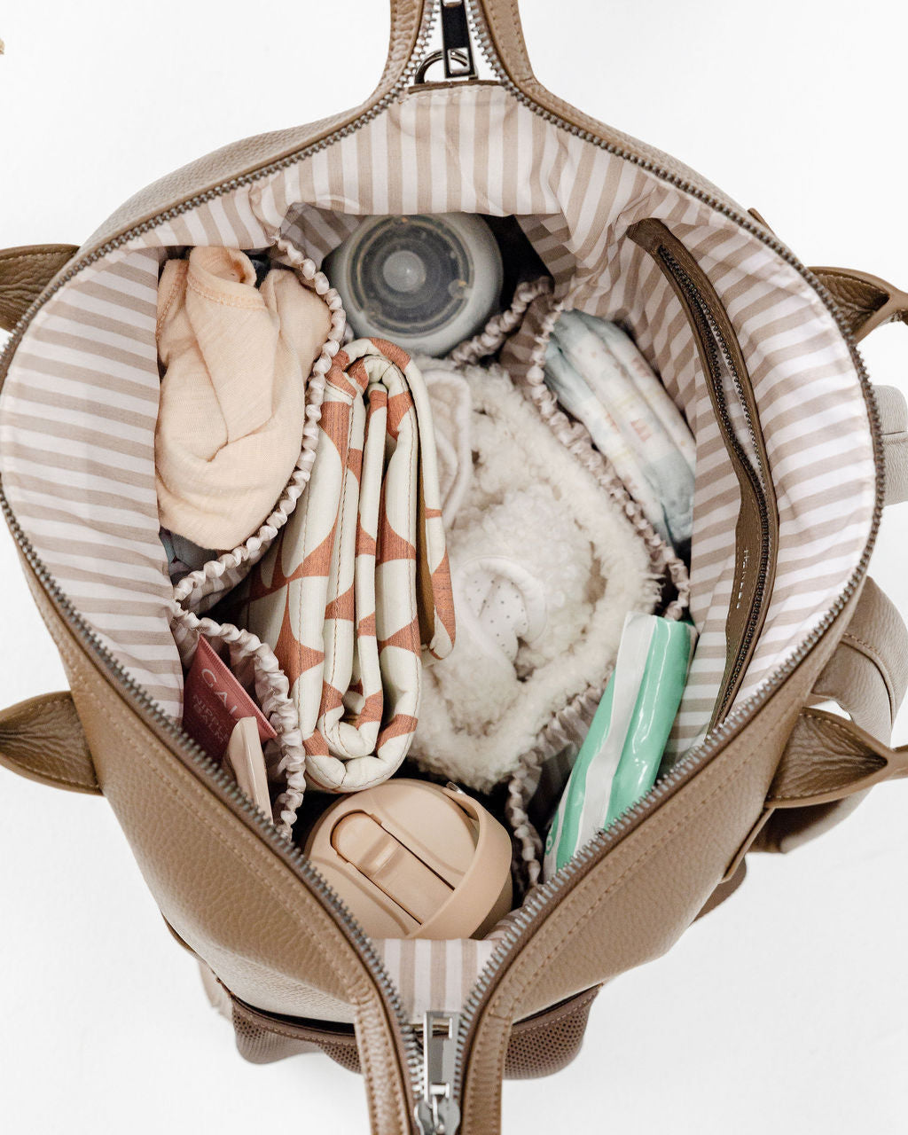 Water & stain resistant eco nylon in our custom fawn stripe pattern, making it easy to see what's inside.